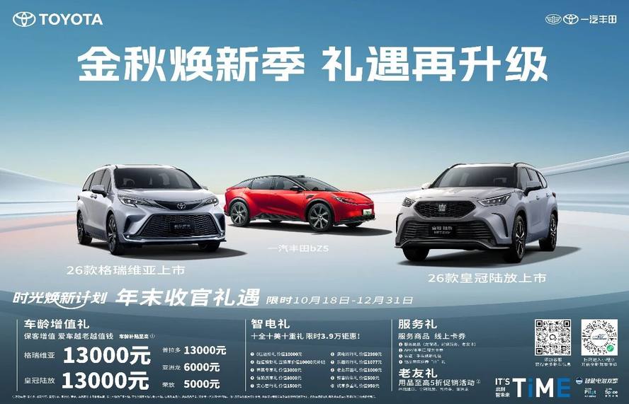 不止如此,为回馈用户厚爱,一汽丰田金秋焕新季,礼遇再升级。10月18日至12月31日,皇冠陆放、格瑞维亚、普拉多等重磅车型不仅可享至高1.3万元的车龄增值礼;同时还有智电礼、服务礼和用品至高5折的好友礼等多重大礼,以极致诚意为用户创造最佳购车时机。